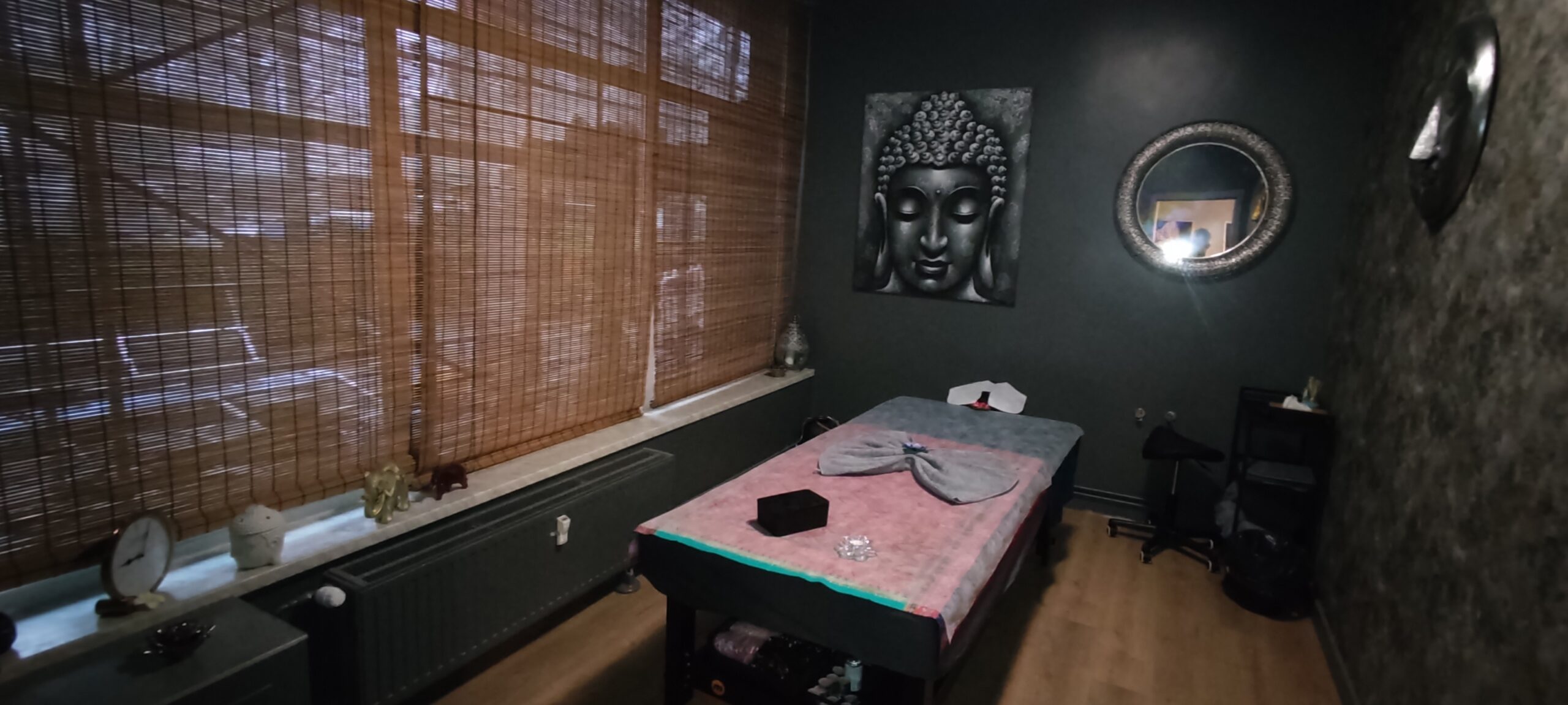 - aranżację strefy zabiegowej z wygodnym łóżkiem do masażu oraz strefy oczekiwania z miękką sofą, roślinami doniczkowymi i subtelnymi akcentami dekoracyjnymi.